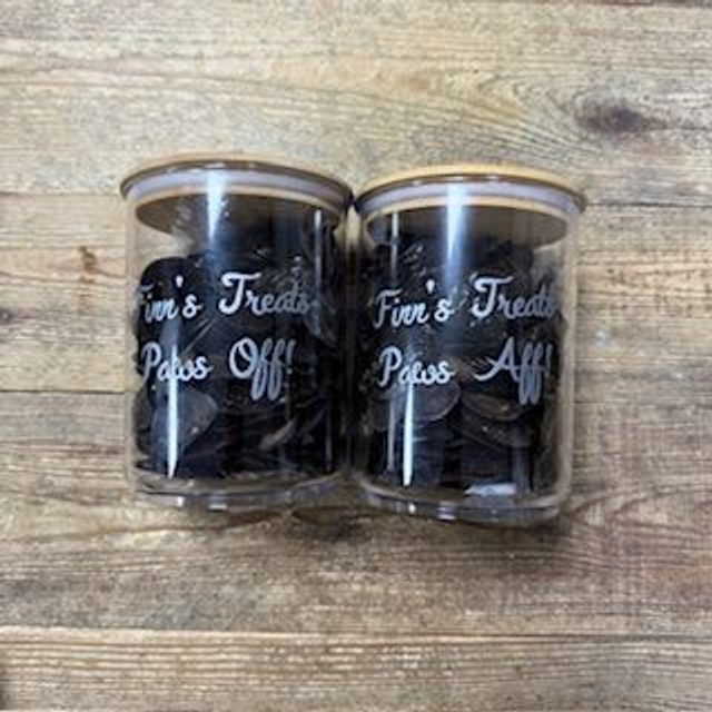A BPA Free Plastic Jar with Bamboo Air Tight Seal Lid, filled with 200g of our Best Selling Liver Snacks treats.